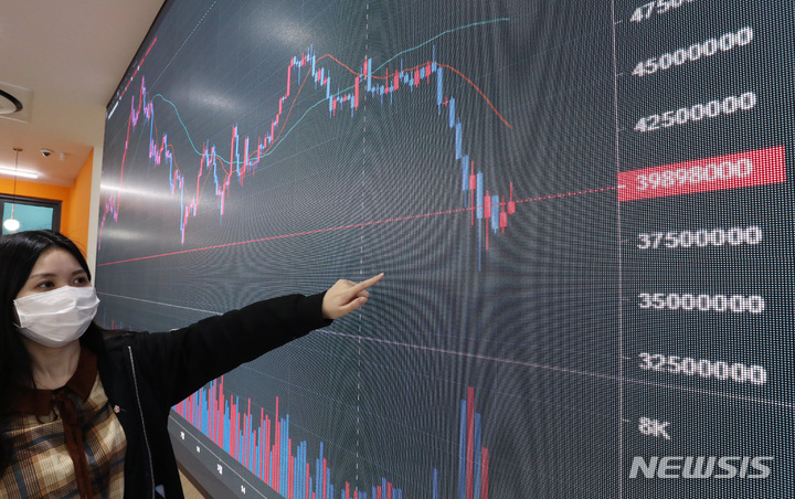 [서울=뉴시스] 김진아 기자 = 코인 시장을 흔들어놨던 테라 사태 후 비트코인이 소폭 상승하고 있는 16일 서울 서초구 빗썸 고객센터 전광판에 비트코인 시세가 표시되고 있다. 16일 오전 9시 기준 국내 암호화폐 거래소 빗썸에서 비트코인은 24시간 전보다 2.50% 오른 4089만9000원을 기록했다. 2022.05.16. [email protected]