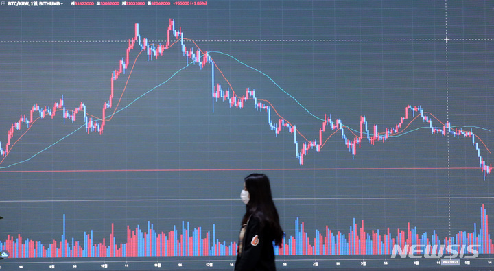 [서울=뉴시스] 김진아 기자 = 코인 시장을 흔들어놨던 테라 사태 후 비트코인이 소폭 상승하고 있는 16일 서울 서초구 빗썸 고객센터 전광판에 비트코인 시세가 표시되고 있다. 16일 오전 9시 기준 국내 암호화폐 거래소 빗썸에서 비트코인은 24시간 전보다 2.50% 오른 4089만9000원을 기록했다. 2022.05.16. [email protected]