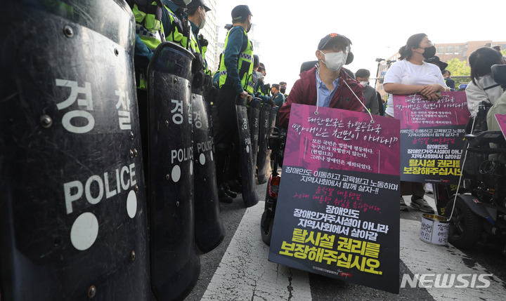 [서울=뉴시스] 추상철 기자 = 전국장애인자별철폐연대(전장연)가 17일 오전 서울 용산구 신용산역 인근에서 '장애인권리예산 22년 추경반영'을 촉구하는 출근길 행진을 하고 있다. 2022.05.17. [email protected]