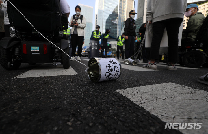 [서울=뉴시스] 추상철 기자 = 전국장애인자별철폐연대(전장연)가 17일 오전 서울 용산구 신용산역 인근에서 '장애인권리예산 22년 추경반영'을 촉구하는 출근길 행진을 하고 있다. 2022.05.17. [email protected]