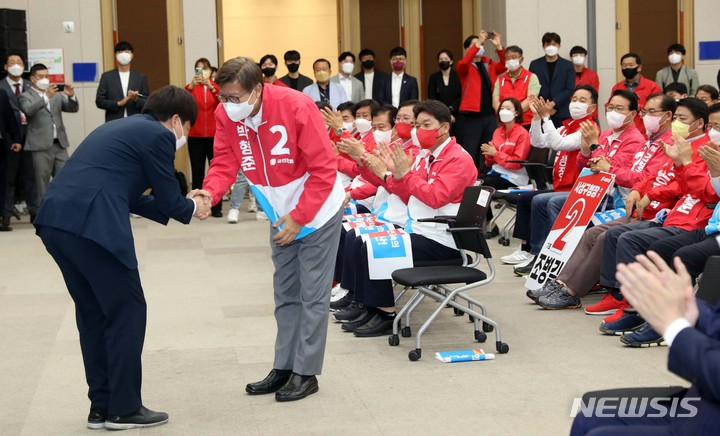 [부산=뉴시스] 하경민 기자 = 이준석 국민의힘 대표가 17일 오전 부산 동구 부산항국제전시컨벤션센터에서 열린 제8회 전국동시지방선거 국민의힘 부산선거대책위원회 출범 및 필승결의대회'에 참석, 인사말을 한 뒤 박형준 부산시장 후보와 악수하고 있다. 2022.05.17. [email protected]