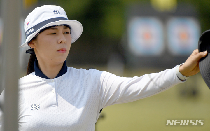 [광주=뉴시스] 류형근 기자 = 17일 오후 광주 남구 광주국제양궁장에서 열린 광주2022현대양궁월드컵 컴파운드 예선전, 국가대표 김윤희(전북도청)가 출전 준비를 하고 있다. 광주양궁월드컵은 이날부터 22일까지 38개국, 381명의 선수단이 참여해 광주국제양궁장(예선)과 광주여자대학교(결승)에서 펼쳐진다. 2022.05.17. [email protected]