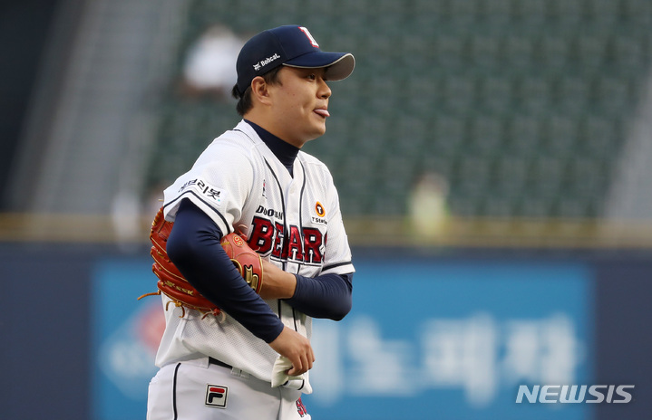 [서울=뉴시스] 이영환 기자 = 17일 오후 서울 송파구 잠실야구장에서 열린 2022 프로야구 SSG 랜더스와 두산 베어스의 경기, 1회초 3실점으로 수비를 마친 두산 선발 이영하가 덕아웃으로 들어가고 있다. 2022.05.17. [email protected]
