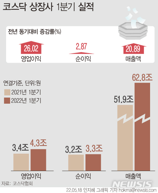 [서울=뉴시스] 18일 한국거래소에 따르면 코스닥 상장사 12월 결산법인 가운데 비교할 수 있는 1050개사의 1분기 연결 기준 매출은 지난해 1분기보다 20.89%, 영업이익은 26.02% 늘어났다. (그래픽=안지혜 기자)
