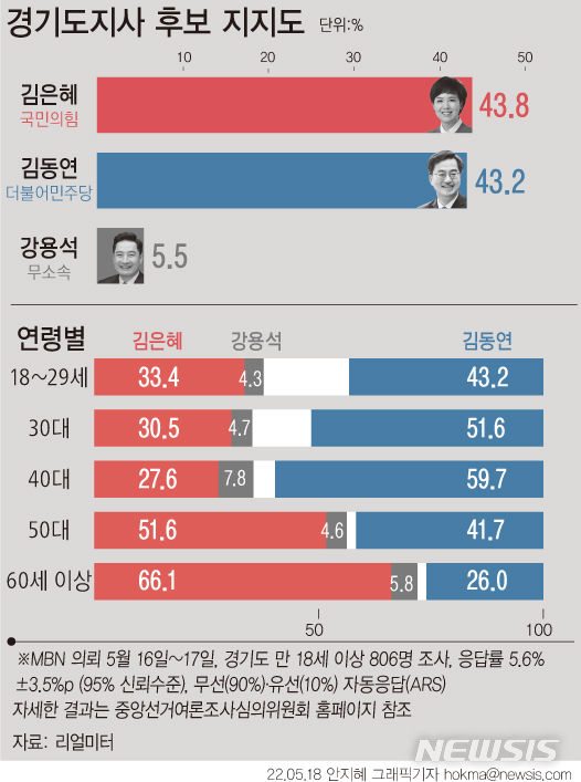 [그래픽] 경기도지사, 김은혜 43.8% 김동연 43.2%…0.6%p차 초접전