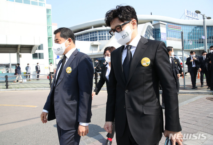 [광주=뉴시스] 전신 기자 = 한동훈(오른쪽) 법무부 장관과 박대출 국민의힘 의원이 광주 5·18 민주화운동 제42주년 기념행사 참석을 위해 18일 광주송정역에 도착하고 있다. 2022.05.18. [email protected]