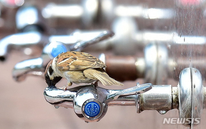 [대구=뉴시스] 이무열 기자 = 대구 낮 최고기온이 29도까지 오르면서 초여름 날씨를 보인 19일 오후 대구 중구 달성공원 수돗가에서 참새 한 마리가 목을 축이고 있다. 2022.05.19. [email protected]