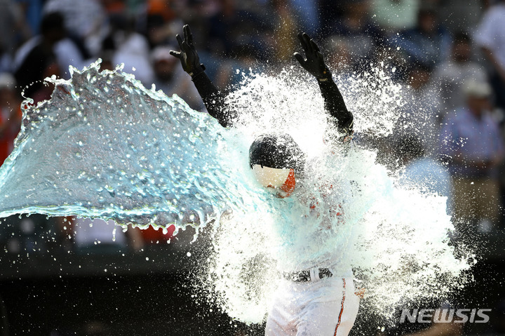 [볼티모어=AP/뉴시스] 볼티모어 오리올스의 앤서니 산탄데르가 19일(현지시간) 미 메릴랜드주 볼티모어의 오리올 파크에서 열린 2022 메이저리그 뉴욕 양키스와의 경기에서 9회 말 끝내기 3점 홈런을 친 후 홈으로 들어오면서 축하 세례를 받고 있다. 오리올스가 양키스에 9-6 승리를 거뒀다. 2022.05.20.