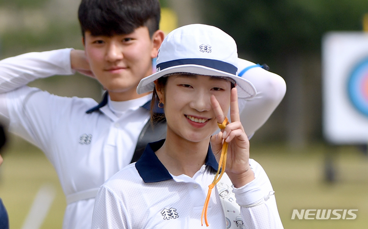 [광주=뉴시스] 류형근 기자 = 광주2022현대양궁월드컵 개막 4일째인 20일 오전 광주 남구 광주국제양궁장에서 열린 리커브 혼성 경기 16강전, 최미선(순천시청)이 승리한 뒤 '손가락 V'를 하며 기뻐하고 있다. 2022.05.20. [email protected]