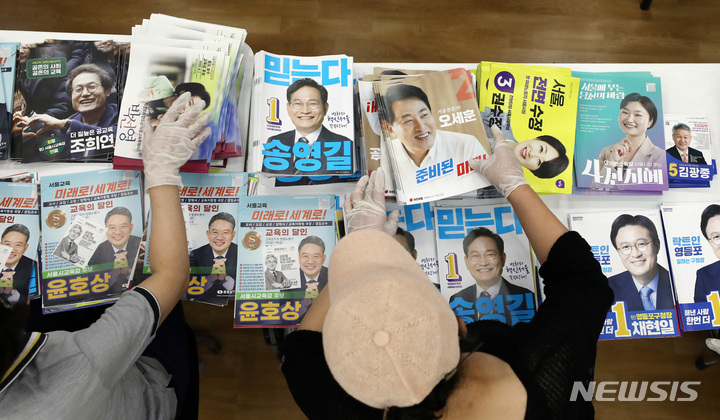 [서울=뉴시스] 이영환 기자 = 21일 오전 서울 영등포구 영등포본동 주민센터에서 제8회 전국동시지방선거 선거공보 및 투표 안내문 발송 작업이 진행되고 있다. 2022.05.21. [email protected]