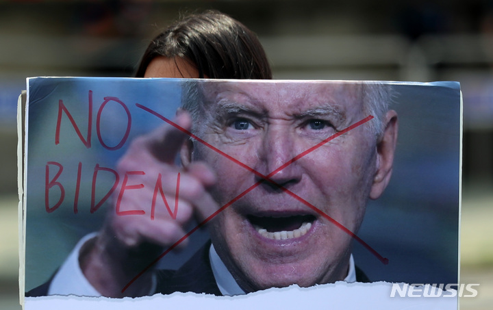 [서울=뉴시스] 이영환 기자 = 21일 오후 서울 용산구 전쟁기념관 앞에서 열린 한미 정상회담 대응행동에서 한 참석자가 바이든 대통령 방한을 규탄하며 피켓을 들고 있다. 2022.05.21. [email protected]