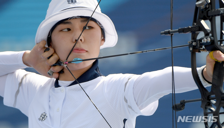 [광주=뉴시스] 류형근 기자 = 광주2022현대양궁월드컵 개막 5일째인 21일 오후 광주 광산구 광주여자대학교 운동장에서 열린 컴파운드 여자 개인전 결승경기, 한국의 김윤희(현대모비스)가 활 시위를 당기고 있다. 김윤희는 무노즈 안드레아를 144대 140으로 누르고 금메달을 차지했다. 2022.05.21. [email protected]