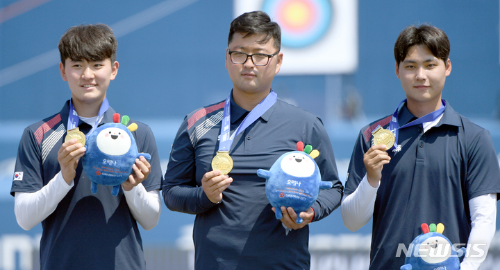 [광주=뉴시스] 류형근 기자 = 광주2022현대양궁월드컵 개막 6일째인 22일 오전 광주 광산구 광주여자대학교 운동장에서 열린 리커브 남자 단체전 시상식에서 김제덕(경북일고)·김우진(청주시청)·이우석(코오롱)이 금메달을 들어보이고 있다. 2022.05.22. [email protected]