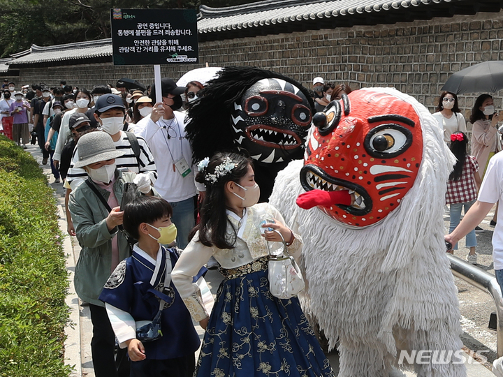 [서울=뉴시스] 조수정 기자 = 22일 오후 서울 종로구 창경궁 돌담길에서 열린 2022 봄 궁중문화축전 골목길 퍼레이드 ‘구나행(驅儺行)-흑호 납시오!’에서 시민들이 공연을 관람하고 있다. 문화재청 궁능유적본부와 한국문화재재단이 주최, 주관하는 '2022 봄 궁중문화축전 ‘구나행(驅儺行)-흑호 납시오!’는 궁궐 주위의 골목상권을 돌며 역병을 쫓는 벽사의식과 재수소망을 빌어주는 축원 연회를 현대적으로 연출한 퍼레이드다. 2022.05.22. [email protected]