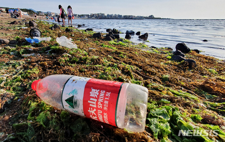 [제주=뉴시스] 우장호 기자 = 22일 오후 제주시 이호해수욕장 해변에 중국발 플라스틱 해양 쓰레기가 떠내려와 괭생이 모자반 등 해초류와 섞여 있다. 2022.05.22. [email protected]
