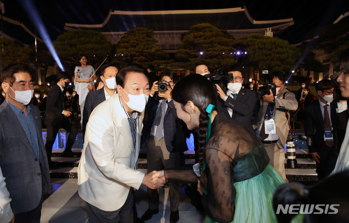 [서울=뉴시스] 전신 기자 = 윤석열 대통령이 22일 청와대 본관 앞 대정원에서 열린 KBS 열린음악회에서 국악인 송소희 씨를 격려하고 있다. 2022.05.22. [email protected]