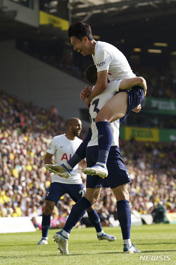 [노리치=AP/뉴시스] 토트넘 홋스퍼의 손흥민이 22일(현지시간) 영국 노리치의 캐로 로드에서 열린 노리치 시티와의 2021-22시즌 잉글랜드 프리미어리그(EPL) 최종 38라운드 후반 25분 팀의 네 번째 골(22호)을 넣고 동료들과 기쁨을 나누고 있다. 손흥민은 5분 뒤 환상적인 골(23호)로 멀티 골을 기록하며 팀의 5-0 대승에 기여했고 모하메드 살라(리버풀)와 공동으로 득점왕에 등극했다. 토트넘은 리그 4위로 다음 시즌 유럽축구연맹(UEFA) 챔피언스리그 티켓을 따냈다. 2022.05.23.
