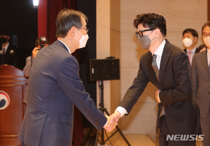 [세종=뉴시스] 강종민 기자 = 한덕수 국무총리가 23일 오전 세종시 정부세종청사에서 열린 취임식에서 한동훈 법무부 장관과 악수하고 있다. 2022.05.23. [email protected]