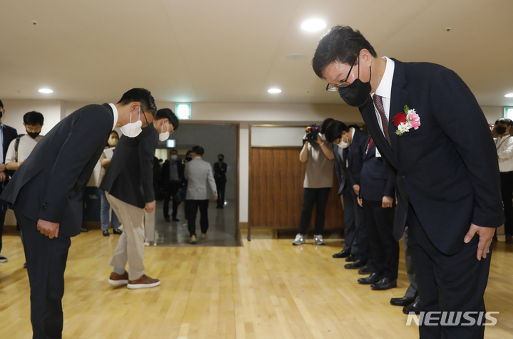 [서울=뉴시스] 고승민 기자 = 송경호 신임 서울중앙지방검찰청 검사장이 23일 서울 서초구 청사에서 열린 제63대 검사장 취임식을 마친 후 직원들과 인사를 하고 있다. 2022.05.23. [email protected]