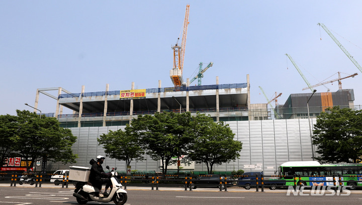[서울=뉴시스] 추상철 기자 = 서울시와 국토부가 공사 중단 사태를 빚고 있는 둔촌주공 재건축 아파트 사업장에 대한 실태 점검에 나선다. 23일 오후 멈춰선 서울 강동구 둔촌주공 아파트 현장이 보이고 있다. 2022.05.23. [email protected]