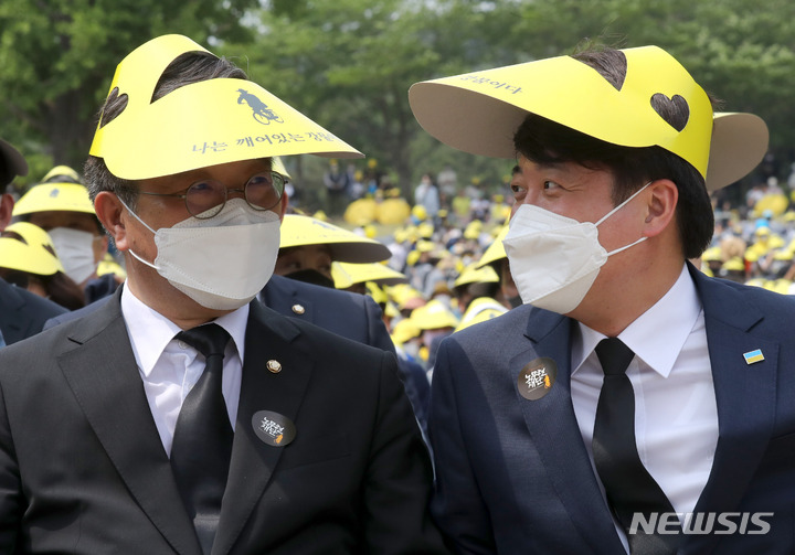 [김해=뉴시스] 전진환 기자 = 이준석 국민의힘 대표와 윤호중 더불어민주당 공동비대위원장이 23일 오후 경남 김해시 진영읍 봉하마을 생태문화공원에서 열린 故 노무현 전 대통령 서거 13주기 공식 추도식에 참석해 자리하고 있다. 2022.05.23. [email protected]
