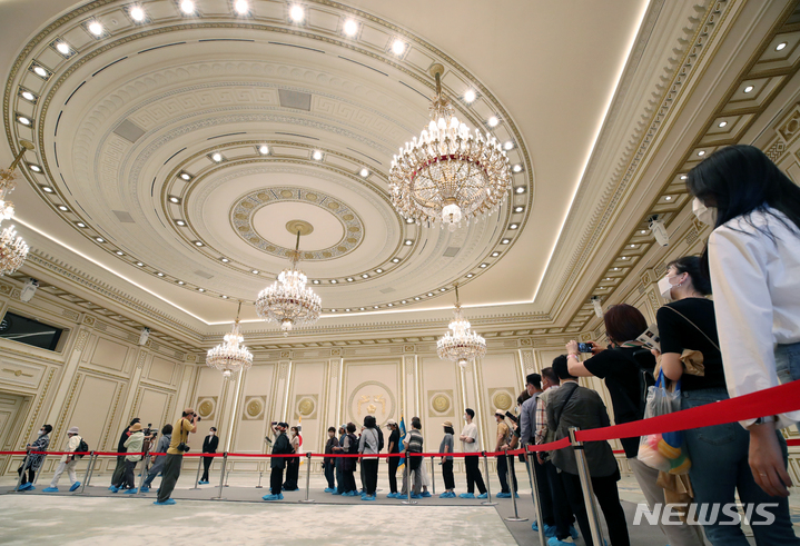 [서울=뉴시스] 조성우 기자 = 문화재청이 청와대 개방 2주를 맞은 23일부터 청와대 영빈관과 춘추관 내부를 일반에 공개했다. 23일 오후 서울 종로구 청와대 영빈관을 찾은 시민들이 관람을 하기 위해 줄을 서고 있다. 2022.05.23. [email protected]