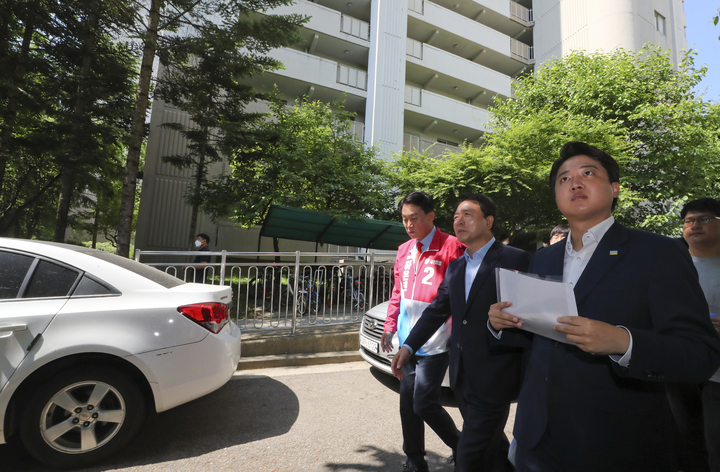 [군포=뉴시스] 최진석 기자 = 이준석(오른쪽) 국민의힘 상임선거대책위원장이 24일 오전 경기 군포시 한 아파트에 1기 신도시 재정비사업 신속 추진을 위한 현장방문을 하고 있다. 가운데는 성일종 국민의힘 정책위의장. 2022.05.24. [email protected]