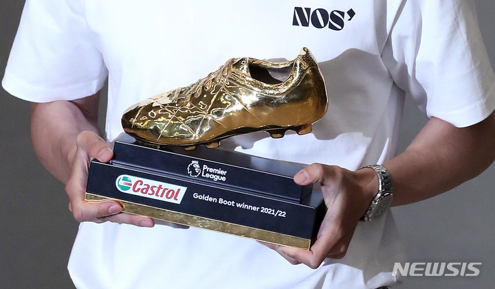 [인천공항=뉴시스] 김진아 기자 = 아시아 선수 최초로 잉글랜드 프로축구 프리미어리그(EPL) 득점왕에 오른 손흥민(토트넘)이 24일 오후 인천국제공항을 통해 귀국, 골든부츠를 들고 포즈를 취하고 있다. 2022.05.24. [email protected]