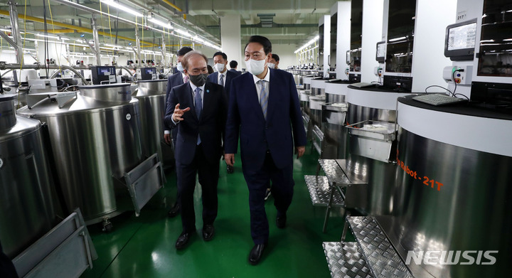 [청주=뉴시스] 홍효식 기자 = 윤석열 대통령이 26일 충북 청주 국립보건연구원 바이오뱅크(국립중앙인체자원은행)에서 액체질소냉동고를 시찰하고 있다. 2022.05.26. [email protected]