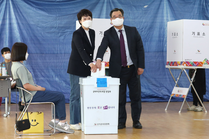 [성남=뉴시스] 국회사진기자단 = 제8회 전국동시지방선거 사전투표 첫날인 27일 오전 김은혜 국민의힘 경기도지사 후보가 남편 유형동씨와 경기 분당구 운중동행정복지센터에 마련된 사전투표소에서 투표를 하고 있다. 2022.05.27. [email protected]