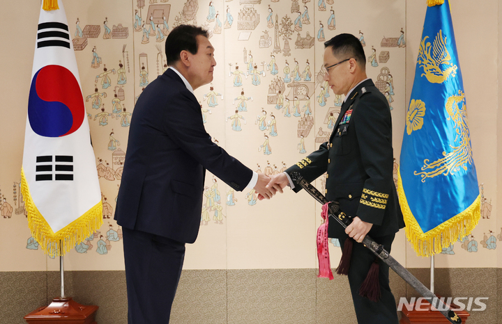 [서울=뉴시스] 홍효식 기자 = 윤석열 대통령이 27일 오전 용산 대통령실 청사에서 열린 장성 진급 보직 신고 및 삼정검 수치 수여식에서 박정환 육군참모총장의 삼정검에 수치를 달아 준 뒤 악수하고 있다. (대통령실통신사진기자단) 2022.05.27. [email protected]
