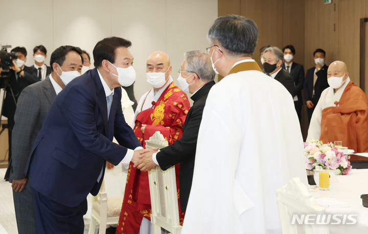 [서울=뉴시스] 전신 기자 = 윤석열 대통령이 28일 서울 용산 대통령실 청사에서 열린 7대 종단 지도자 오찬에서 천주교 김희중 대주교와 인사하고 있다. (대통령실통신사진기자단) 2022.05.28. [email protected]