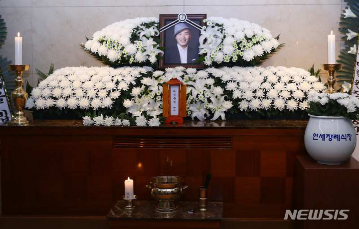 [서울=뉴시스] 사진공동취재단= 심근경색으로 갑작스럽게 세상을 떠난 개그맨 고(故) 임준혁의 빈소가 28일 오후 서울 서대문구 신촌 세브란스병원 장례식장에 마련됐다. 임준혁은 전날 밤 자택에서 사망했다. 2022.05.28. [email protected]