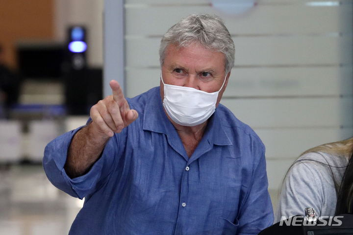 [인천공항=뉴시스] 조성우 기자 = 히딩크 감독이 28일 오후 인천국제공항 제2여객터미널을 통해 여자친구 엘리자베스와 함께 입국하고 있다. 2022.05.28. [email protected]