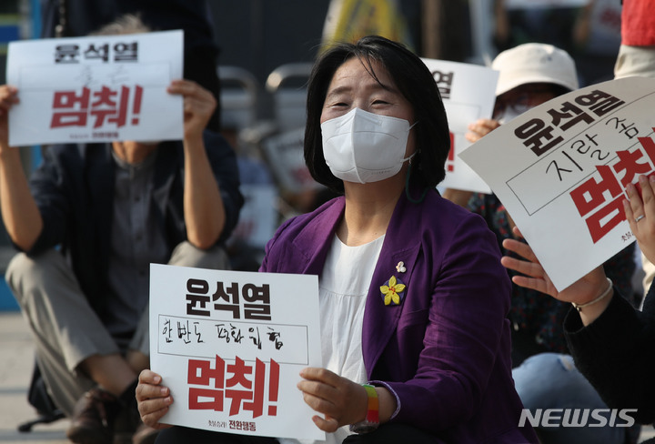 [서울=뉴시스] 조수정 기자 = 윤미향 무소속 의원이 28일 서울 용산구 이태원광장에서 열린 촛불승리전환행동 주최 윤석열 정부 정책 비판 집회에 참석하고 있다. 2022.05.28. [email protected]