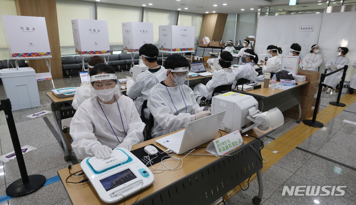 [서울=뉴시스] 조수정 기자 = 제8회 전국동시지방선거 사전투표 둘쨋날인 28일 오후 서울 용산구의회에 마련된 이태원1동 사전투표소에서 코로나19 확진 등 격리 유권자 투표 시간에 앞서 선거 사무 관계자들이 방호복을 착용하며 준비하고 있다. 2022.05.28. [email protected]