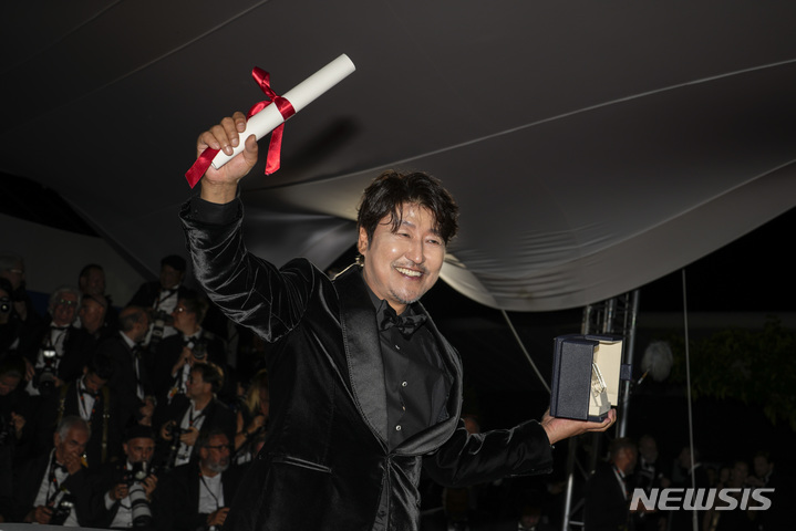 [칸=AP/뉴시스] 배우 송강호가 28일(현지시간) 프랑스 칸 뤼미에르 대극장에서 열린 제75회 칸국제영화제 시상식에서 영화 '브로커'로 남우주연상을 받고 포즈를 취하고 있다. 2022.05.29.