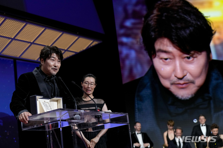 [칸=AP/뉴시스] 배우 송강호가 28일(현지시간) 프랑스 칸 뤼미에르 대극장에서 열린 제75회 칸국제영화제 시상식에서 영화 '브로커'로 남우주연상을 받고 소감을 말하고 있다. 2022.05.29.