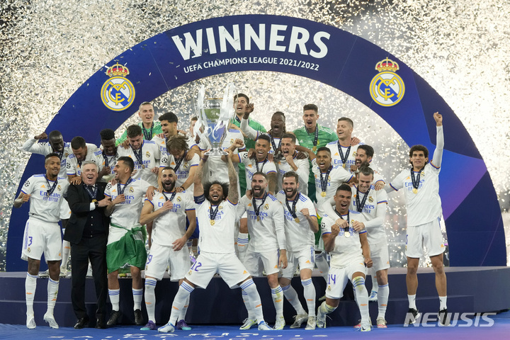 [생드니=AP/뉴시스] 레알 마드리드(스페인) 선수들이 28일(현지시간) 프랑스 생드니의 스타드 드 프랑스에서 열린 리버풀(잉글랜드)과의 2021-22 유럽축구연맹(UEFA) 챔피언스리그(UCL)에서 승리, 우승컵 '빅이어'를 들고 환호하고 있다. 레알 마드리드는 후반 14분 비니시우스 주니오르의 결승 골로 리버풀을 1-0으로 꺾고 4년 만에 정상에 올라 통산 14번째 우승을 기록했다. 2022.05.29.