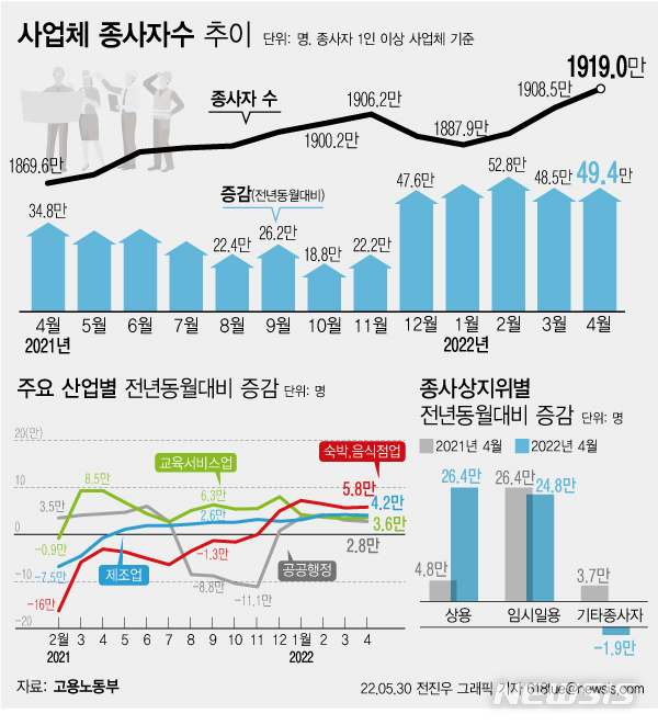 [서울=뉴시스] 30일 고용노동부에 따르면 지난달 마지막 영업일 기준 종사자 1인 이상 사업체의 종사자는 1919만명으로, 전년 동월보다 49만4000명(2.6%) 증가했다. 거리두기 직격탄인 숙박·음식업도 6개월 연속 증가했다. (그래픽=전진우 기자)