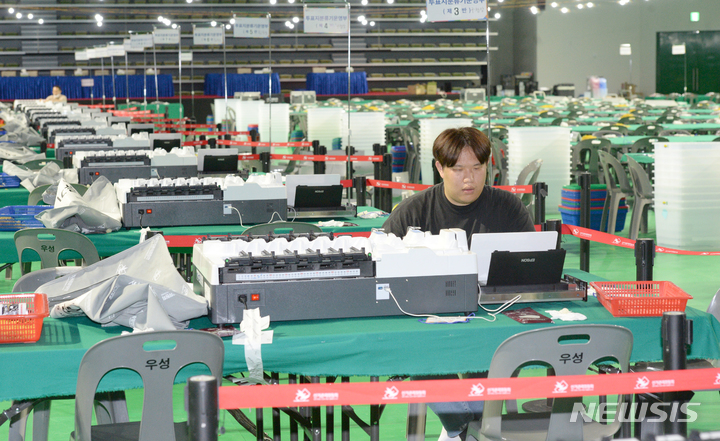[울산=뉴시스] 배병수 기자 = 제8회 전국동시지방선거를 이틀 앞둔 30일 오후 울산 남구 문수체육관에서 선관위관계자들이 투표지분류기 점검을 하고 있다. 2022.05.30. [email protected]
