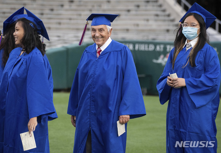 [패서디나=AP/뉴시스] 60년 만에 고교를 졸업하는 테드 샘스(78)가 지난 27일(현지시간) 미 캘리포니아주 패서디나의 샌 가브리엘 고등학교 손녀뻘 되는 학생들 틈에서 1962년도에 발행됐던 졸업장을 받기 위해 기다리고 있다. 학교 측은 당시 책값 4.80달러를 내지 않고 졸업을 포기했던 샘스의 졸업장을 지금까지 보관하고 있었다. 2022.05.31.