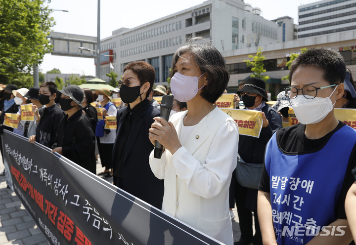 [서울=뉴시스] 고승민 기자 = 강민정 더불어민주당 의원이 31일 서울 용산구 대통령 집무실 앞에서 전국장애인부모연대 주최로 열린 49재 기간 집중 투쟁 선포 기자회견에서 발언하고 있다. 2022.05.31. [email protected]