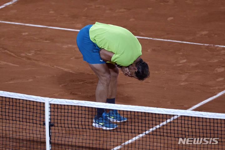 [파리=AP/뉴시스] 라파엘 나달(5위·스페인)이 5월 31일(현지시간) 프랑스 파리의 스타드 롤랑가로스에서 열린 프랑스오픈 테니스대회 8강전에서 노바크 조코비치(1위·세르비아)를 꺾은 후 기뻐하고 있다. 나달은 조코비치를 3-1(6-2 4-6 6-2 7-6)로 제압하고 4강에 올라 알렉산더 즈베레프(3위·독일)와 결승행을 다툰다. 2022.06.01.