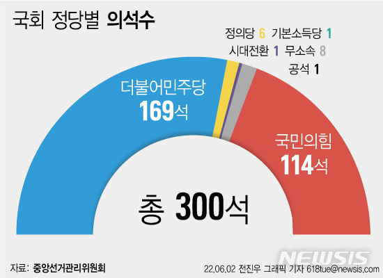 [그래픽] 국회 정달별 의석수… 민주 169석, 국힘 114석