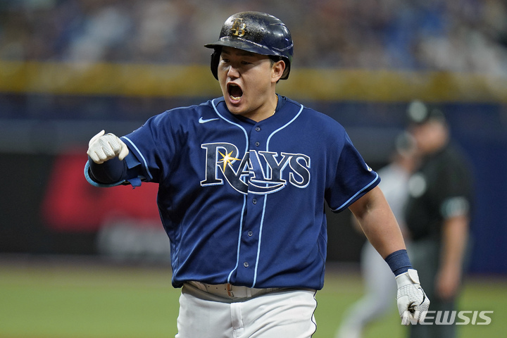 [세인트피터즈버그=AP/뉴시스] 탬파베이 레이스의 최지만이 4일(현지시간) 미 플로리다주 세인트피터즈버그의 트로피카나 필드에서 열린 2022 메이저리그 시카고 화이트삭스와의 경기 5회 말 1타점 적시타를 치고 나가 기뻐하고 있다. 최지만은 4타수 1안타 1타점을 기록했고 팀은 2-3으로 역전패했다. 2022.06.05.