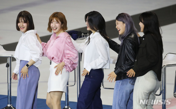 [서울=뉴시스] 권창회 기자 = 쇼트트랙 선수 박지윤(왼쪽부터), 노아름, 이유빈, 서휘민, 김아랑이 5일 오후 서울 양천구 목동 아이스링크장에서 열린 스케이팅 올스타 2022에서 세레모니를 하고 있다. 2022.06.05. [email protected]