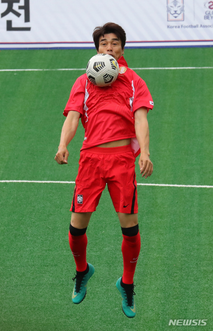 [서울=뉴시스] 배훈식 기자 = 5일 오후 서울 마포구 서울월드컵경기장 보조경기장에서 열린 2002 월드컵 20주년 기념 레전드 올스타전, 골든 에이지 U-14와의 경기에서 전반전 최진철이 나이를 잊은 트레핑을 선보이고 있다. 2022.06.05. [email protected]