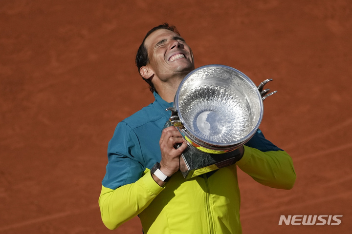 [파리=AP/뉴시스] 라파엘 나달(5위·스페인)이 5일(현지시간) 프랑스 파리의 스타드 롤랑가로스에서 열린 프랑스오픈 테니스대회 단식에서 우승, 트로피를 들고 기뻐하고 있다. 나달은 결승전에서 카스페르 루드(8위·노르웨이)를 3-0(6-3 6-3 6-0)으로 완파하고 이 대회 14번째 정상에 올랐으며 메이저 대회 남자 단식 최다 우승 기록을 22회로 늘렸다. 2022.06.06.
