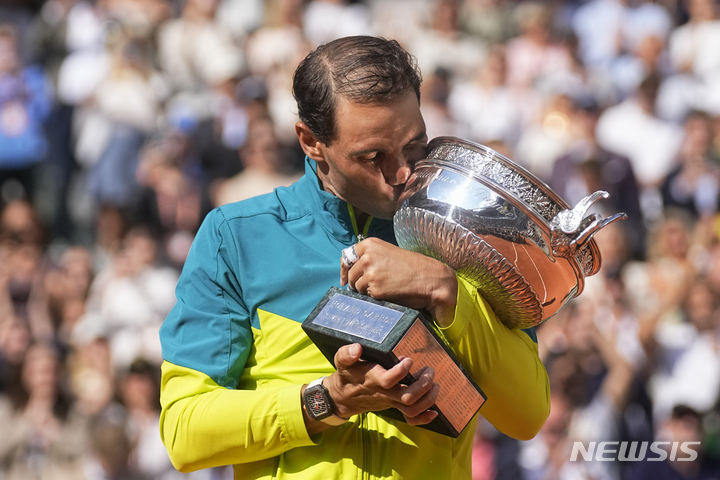 [파리=AP/뉴시스] 라파엘 나달(5위·스페인)이 5일(현지시간) 프랑스 파리의 스타드 롤랑가로스에서 열린 프랑스오픈 테니스대회 단식에서 우승, 트로피를 안고 입 맞추고 있다. 나달은 결승전에서 카스페르 루드(8위·노르웨이)를 3-0(6-3 6-3 6-0)으로 완파하고 이 대회 14번째 정상에 올랐으며 메이저 대회 남자 단식 최다 우승 기록을 22회로 늘렸다. 2022.06.06.